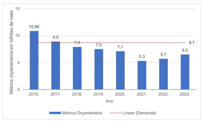 O pesquisador apresenta uma série histórica do orçamento discricionário das Instituições Federais de Ensino Superior no período de 2016 a 2023, o que ilustra a redução das verbas destinadas às universidades (gráfico abaixo, elaborado pelo autor). Outra série histórica exibida atesta, para o mesmo período, a diminuição dos recursos destinados a investimentos, que saíram da ordem de R$ 2,4 bilhões em 2016 para um montante seis vezes menor em 2023, não chegando a R$ 1 bilhão.