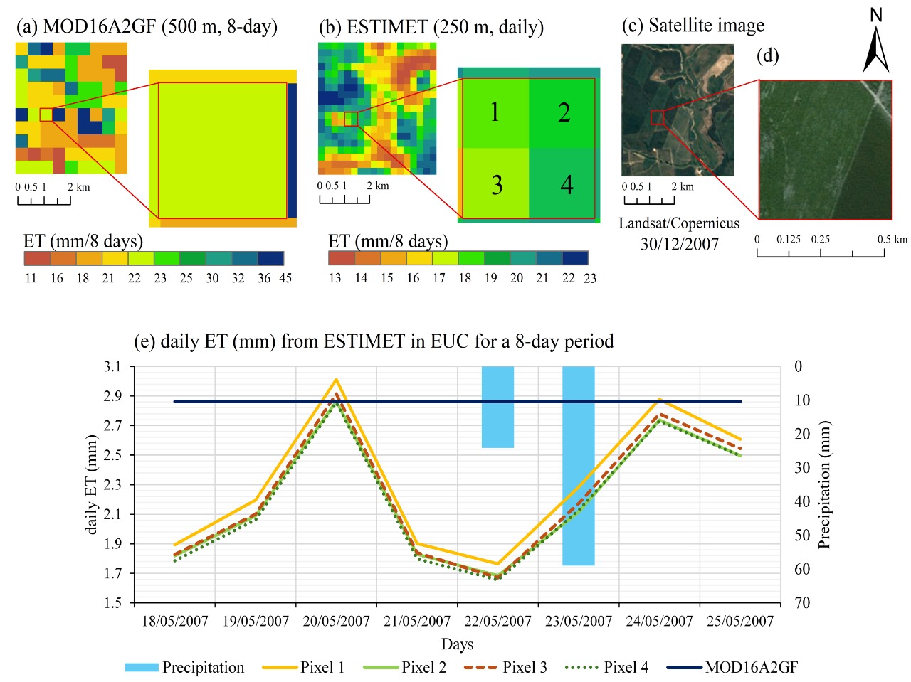 Os dados de evapotranspiração do ESTIMET foram ainda comparados com as estimativas de outros produtos globais que também usavam imagens ou dados de satélites para estimar a evapotranspiração, como o MOD16 (produto da NASA), e mais dois outros produtos globais.