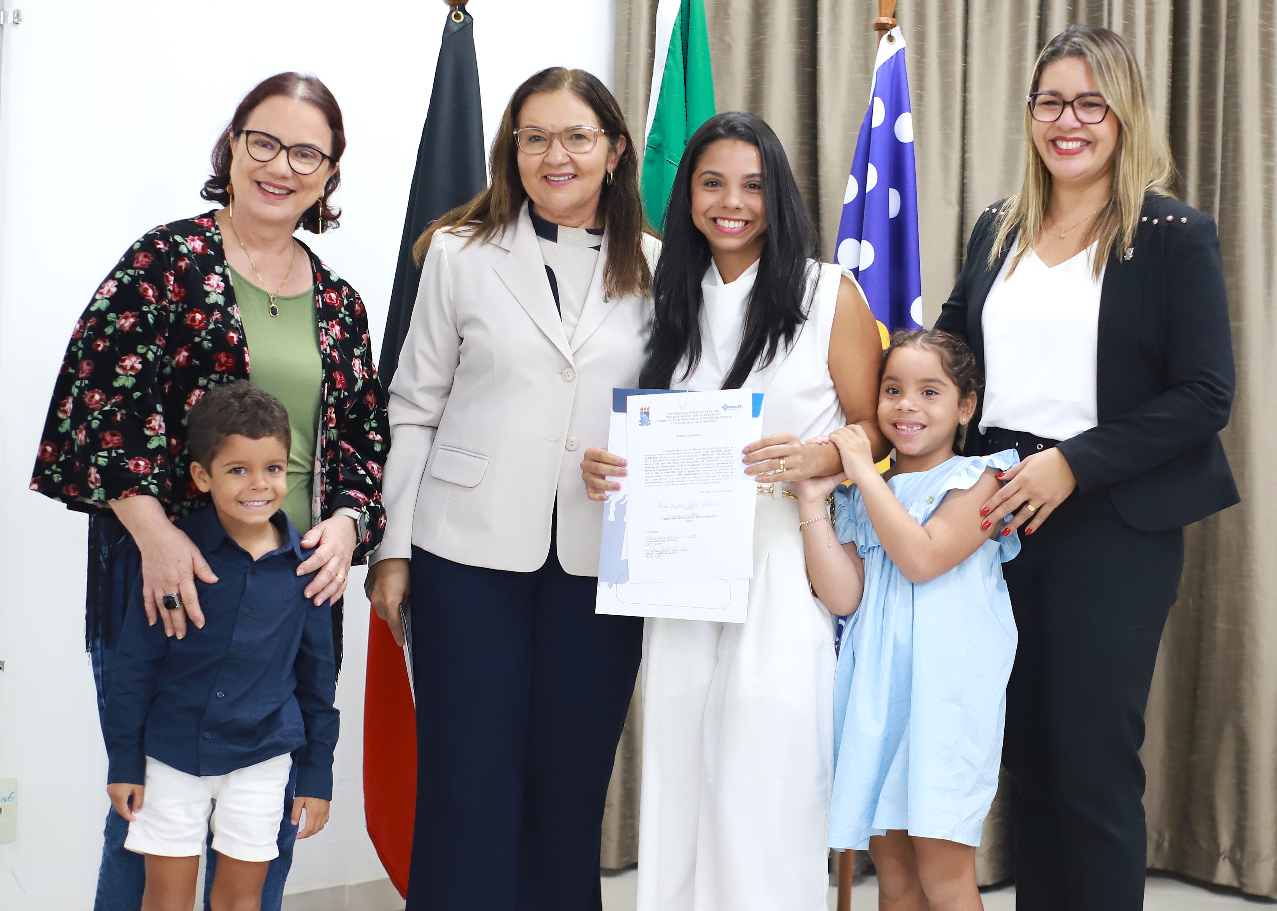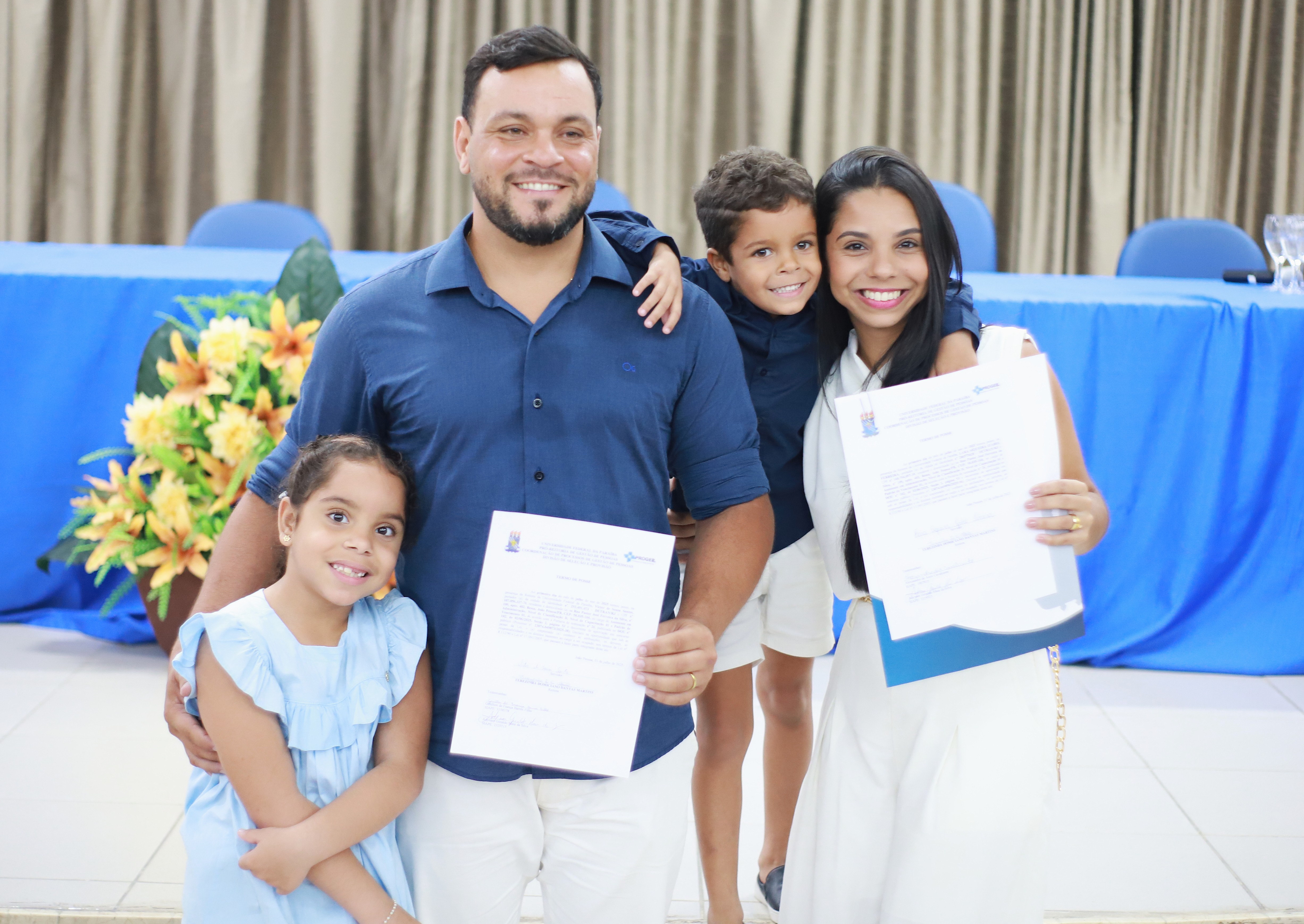 A posse é sempre um momento marcante para os empossados e seus familiares. E, nesta, o recebimento do termo de posse teve ainda mais emoção quando foi chamada a agora assistente administrativa da UFPB, Lara Siqueira Izabel Ferreira. Em meio aos aplausos, todos ouviram “mamãe! mamãe! mamãe!”. Era Sérgio (5 anos) junto com sua irmã Maria (6 anos) vibrando com a mãe tornando-se pela primeira vez servidora pública federal. Logo depois, uma surpresa para os presentes quando Victor de Sousa Santos foi chamado e a mesma voz eufórica gritava “papai! papai! papai!”