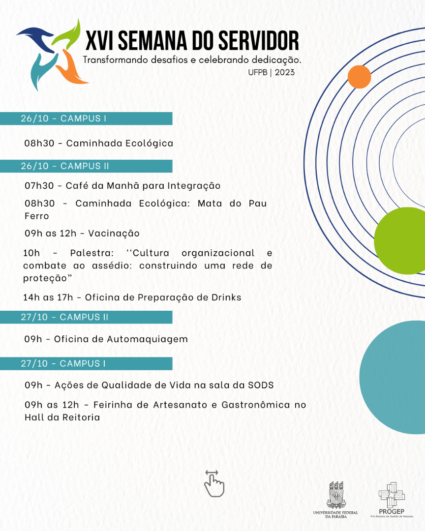 A Pró-Reitoria de Gestão de Pessoas da Universidade Federal da Paraíba (UFPB) celebrará, de 23 a 27 de outubro, o Dia do Servidor Público, comemorado, anualmente, em 28 de outubro. Com o tema ‘‘Transformando desafios e celebrando dedicação’’, a 16º edição da Semana do Servidor terá programações nos quatro campi. No Campus II, em Areia, foram disponibilizados nesta segunda (09) os formulários para as inscrições para as oficinas de drinks e de automaquiagem, e para a caminhada ecológica.